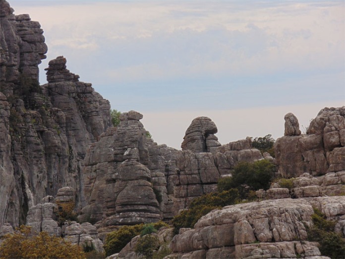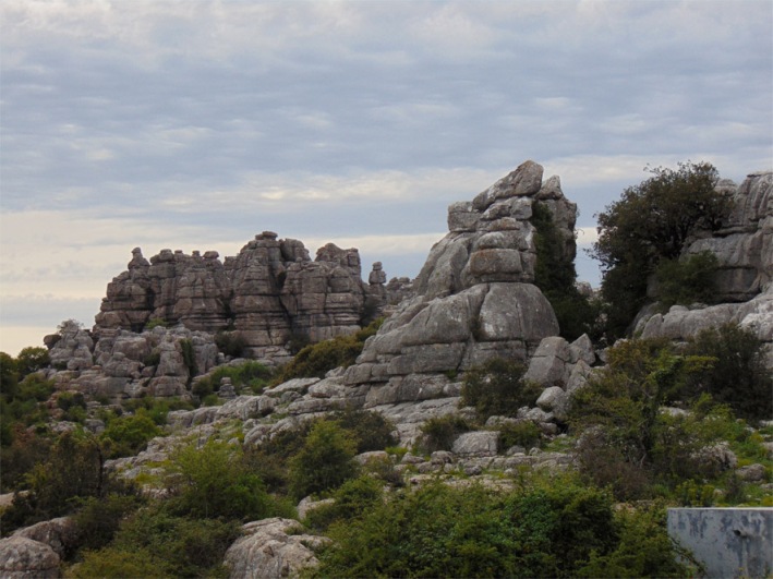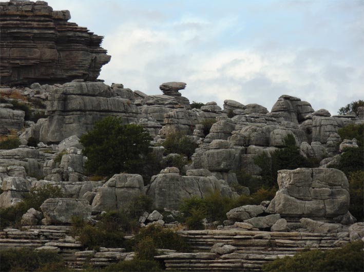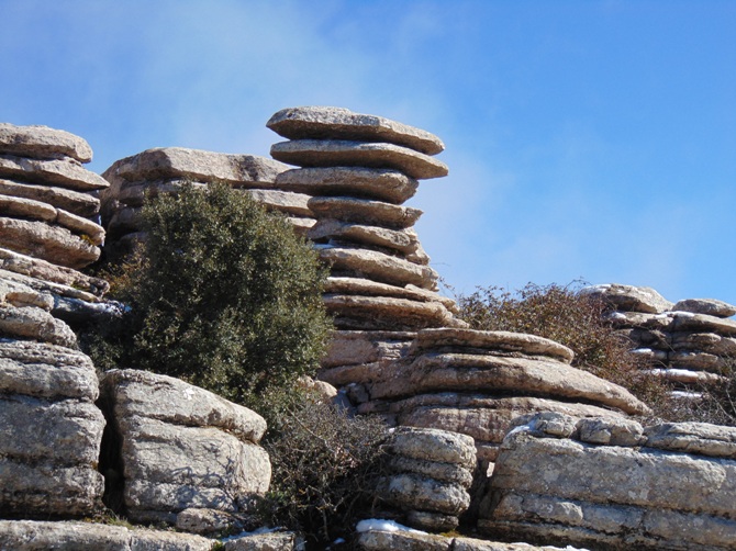 El Torcal está constituido por rocas calizas de tres tipos: oolíticas, brechoides y clásticas. Todas ellas tuvieron su origen en el fondo marino durante el periodo Jurásico, en el período comprendido entre 250 y 150 millones de años atrás. Los sedimentos acumulados en el fondo del mar se agregaban mediante la acción cementadora de las sales y precipitados de la disolución marina. Empujados por las fuerzas del plegamiento alpino emergieron hasta la superficie. Más tarde, una serie de fracturas generaron grietas (diaclasas) y sistemas de fallas que se entrecortan en ángulo recto; la erosión y hundimiento de dichas grietas ha producido lo que llamamos hoy día callejones o "corredores". A partir de este momento el conjunto queda sometido a un proceso de erosión característico, el modelado cárstico. La gelifracción, o fractura de la roca por la acción de cuña que supone el agua que absorbe la roca y se hiela por la acción del frío, junto con la disolución diferencial de las distintas calizas por el efecto ácido del CO2 atmosférico presente en el agua de lluvia, han modelado multitud de formas en las rocas. En primer lugar hay que destacar la frecuencia de horizontalidad en los estratos de roca, hecho que no es habitual en las montañas calizas andaluzas. Esta horizontalidad queda acentuada con la erosión, apareciendo una disposición rítmica de los estratos generada por rotura diferencial al encontrarse alternadas calizas con distinta porosidad y capacidad de absorción de agua. Esta cuña de hielo ha esculpido singularidades rocosas, generando una completa colección de piezas naturales a las que se les pueden atribuir semejanzas con formas de la vida cotidiana (El Tornillo, simbolizado en el logotipo del Paraje).
